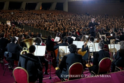 Occorre rammentare, infatti, che nel mondo sono 60 milioni i bambini e i ragazzi che non sono inseriti in alcun percorso di scolarizzazione mentre 160 milioni di minori non accedono al ciclo secondario di istruzione. A questo proposito il papa ha ricordato che il Concerto di Natale sostiene un progetto missionario salesiano nella Repubblica del Congo: la costruzione di una scuola primaria, capace di accogliere 350 bambini. “Anche questo può farci riflettere, ricordandoci che la bellezza, quando è autentica, non rimane chiusa in sé stessa, ma genera scelte di responsabilità per la cura del mondo. Così la cultura diventa respiro per la dignità di tutti, specie dei più fragili” ha affermato “Questa responsabilità etica dell’arte musicale fu ben illustrata dal mio venerato predecessore Papa Francesco che amava la musica e la ascoltava con gusto spirituale”.