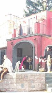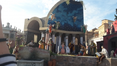 L’architetto Angelo Santitoro ci ha spiegato come sono state realizzate le statue: “Ci siamo rifatti al tipico presepio napoletano che però nasce per interni. Perciò, per proteggerlo dalle intemperie, oltre a legno e terracotta, abbiamo dovuto inserire della resina. Tutte le statue sono vestite secondo i presepi della tradizione napoletana” ed in particolare notiamo gli Angeli che sorreggono la cupola, “con vesti in seta”. Quel clavicembalo, “è il simbolo di Sant’Alfonso Maria de’ Liguori, sepolto a Pagani (Salerno) e patrono della città”.