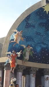 L’idea generale è stata, quindi, quella di unire arte e spiritualità in una scenografia che ricorda fede e tradizione. Ogni singolo elemento ha un significato ben preciso e conduce lo sguardo verso il centro ove si ammira la Natività, con i Re Magi che adorano il Bambino e una pastorella in abiti tradizionali che offre prodotti tipici, vera ricchezza del territorio diocesano. Vediamo statue di zampognari, il Servo di Dio Alfonso Russo. E poi statue di angeli meravigliosi che sembrano quasi sorreggere la cupola.