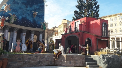 O presépio deste ano, cujo título visa homenagear Sant' Alfonso Maria de' Liguori, autor do famoso canto "Tu scendi dalle Stelle" ("Tu desces das Estrelas") de 1754, é uma obra de extraordinária beleza, enriquecida com símbolos que celebram o patrimônio cultural e gastronômico imaterial da região de Salerno. O presépio se desdobra em um retângulo de 17 por 12 metros, com altura máxima de 7,70 metros, e foi projetado pelo arquiteto Silvio Di Monaco. A obra incorpora elementos típicos da região de Nocera: o Batistério Paleocristão de Nocera Superiore, a Fonte de Helvius localizada em Sant'Egidio del Monte Albino e uma casa típica da área.